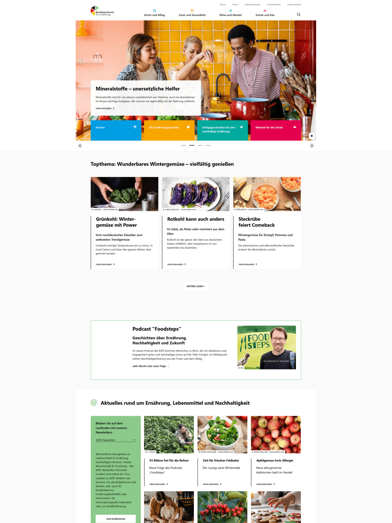 Das Bundeszentrums für Ernährung (BZfE) ist eine zentrale Institution, die umfassende Informationen zu gesunder Ernährung, nachhaltigem Konsum und gesundheitsförderlichen Lebensweisen bereitstellt. Das Ziel der technischen Umsetzung war, ein modernes, benutzerfreundliches und vor allem barrierefreies Portal zu entwickeln, welches den Besuchern des BZfE eine hervorragende Nutzererfahrung bietet und den Anforderungen eines öffentlichen, nutzerorientierten Informationsportals gerecht wird.