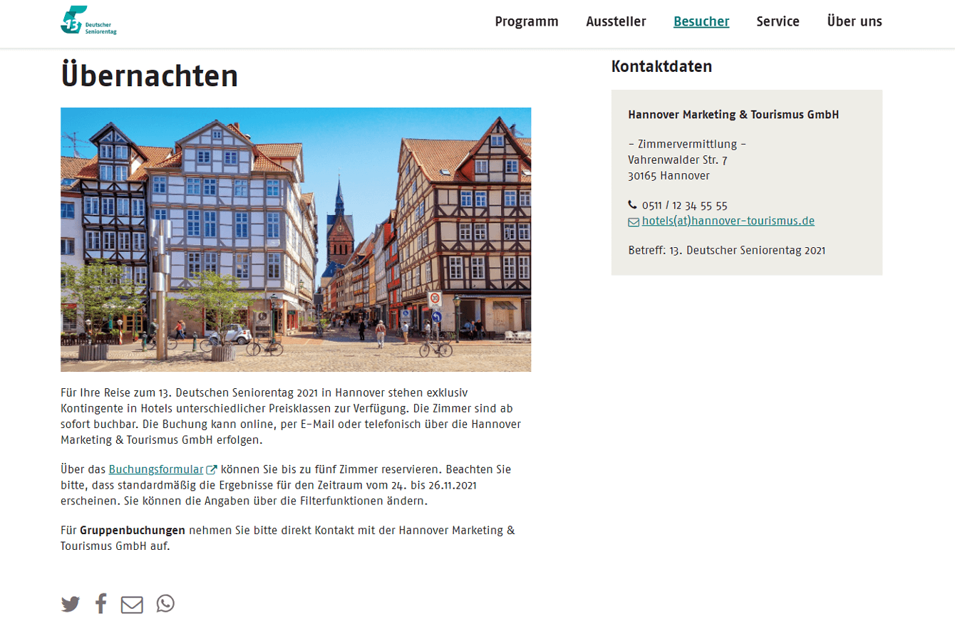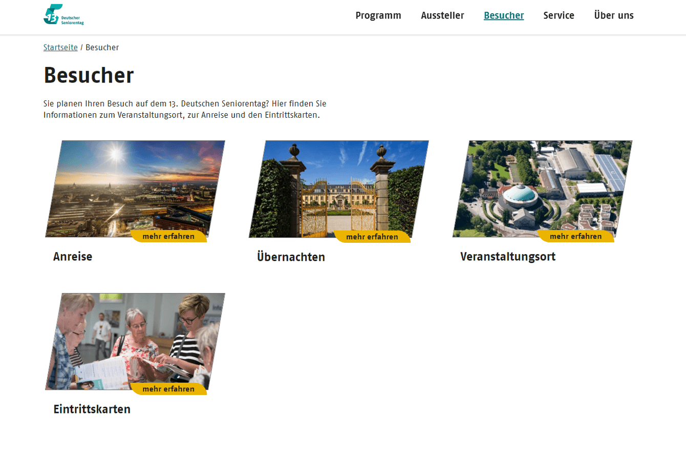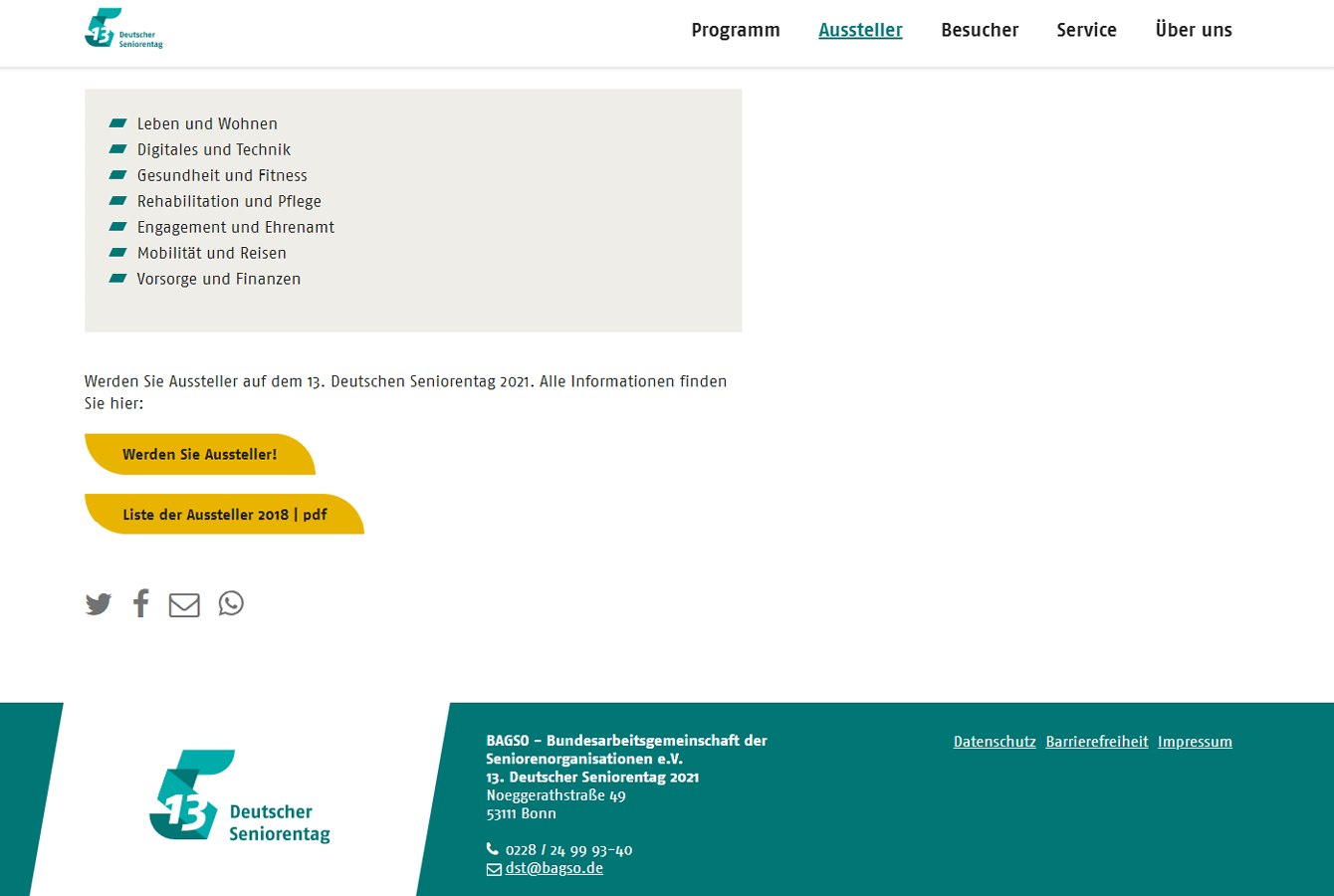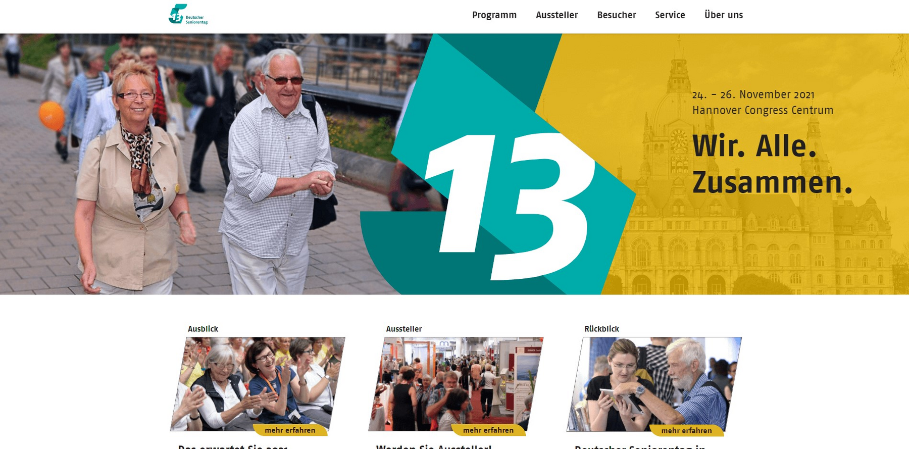 Der Deutsche Seniorentag ist die wichtigste bundesweite Plattform für Austausch, Information und Vernetzung zu allen Themen des Alterns. Er wird alle drei Jahre von der BAGSO (Bundesarbeitsgemeinschaft der Seniorenorganisationen) veranstaltet – das nächste Mal am 24. bis 26. November 2021 in Hannover. Die Website des Seniorentages wurde in frischer und moderner Anmutung und in neuem Corporate Design auf Basis des Content-Management-Systems TYPO3 realisiert. Im Laufe der Zeit werden Informationen zum Programm, den Ausstellern und Sponsoren ergänzt und Funktionen zur Anmeldung freigeschaltet. Die Website ist auf Desktop-PCs wie mobilen Geräten gleichermaßen gut nutzbar und ermöglicht eine schnelle und einfache Orientierung.