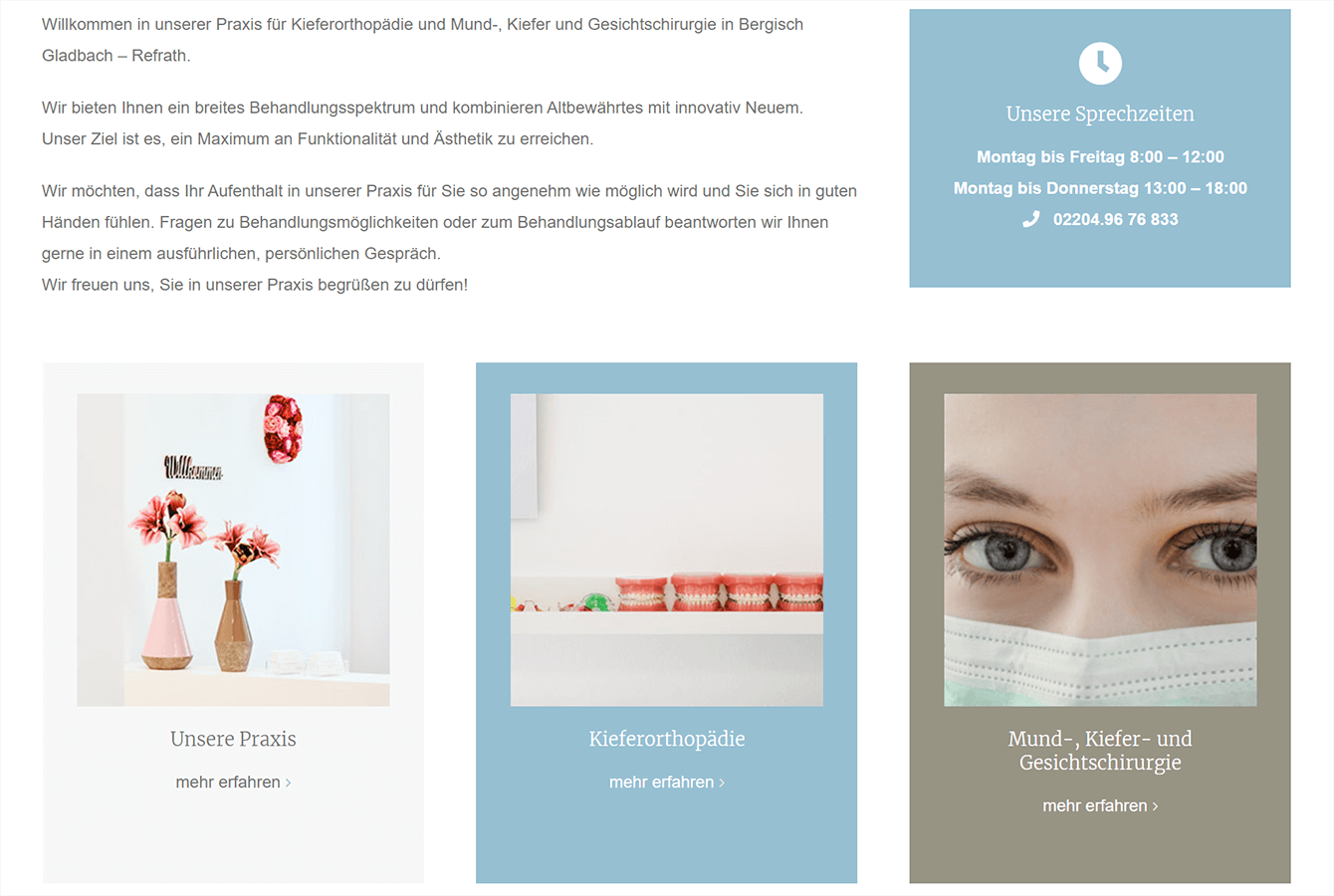 Die Praxis Mager und Neumann ist eine Facharztpraxis für Kieferorthopädie und Mund- Kiefer-Gesichtschirurgie in Bergisch Gladbach – Refrath. SimpleThings hat eine ansprechende und moderne Website auf Basis von WordPress realisiert. Durch Responsive Webdesign ist der Auftritt sowohl mit dem PC als auch mit dem Smartphone optimal nutzbar.