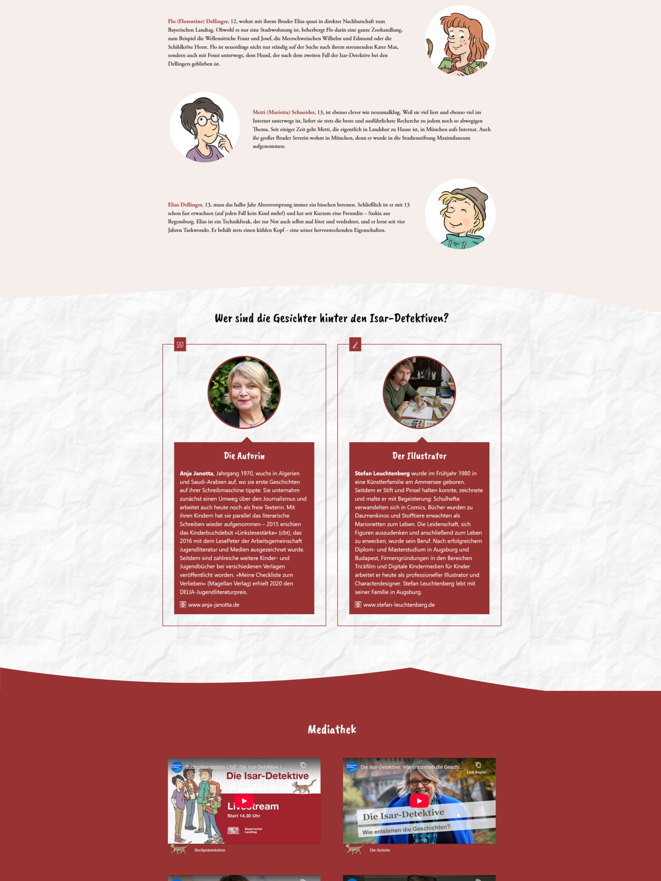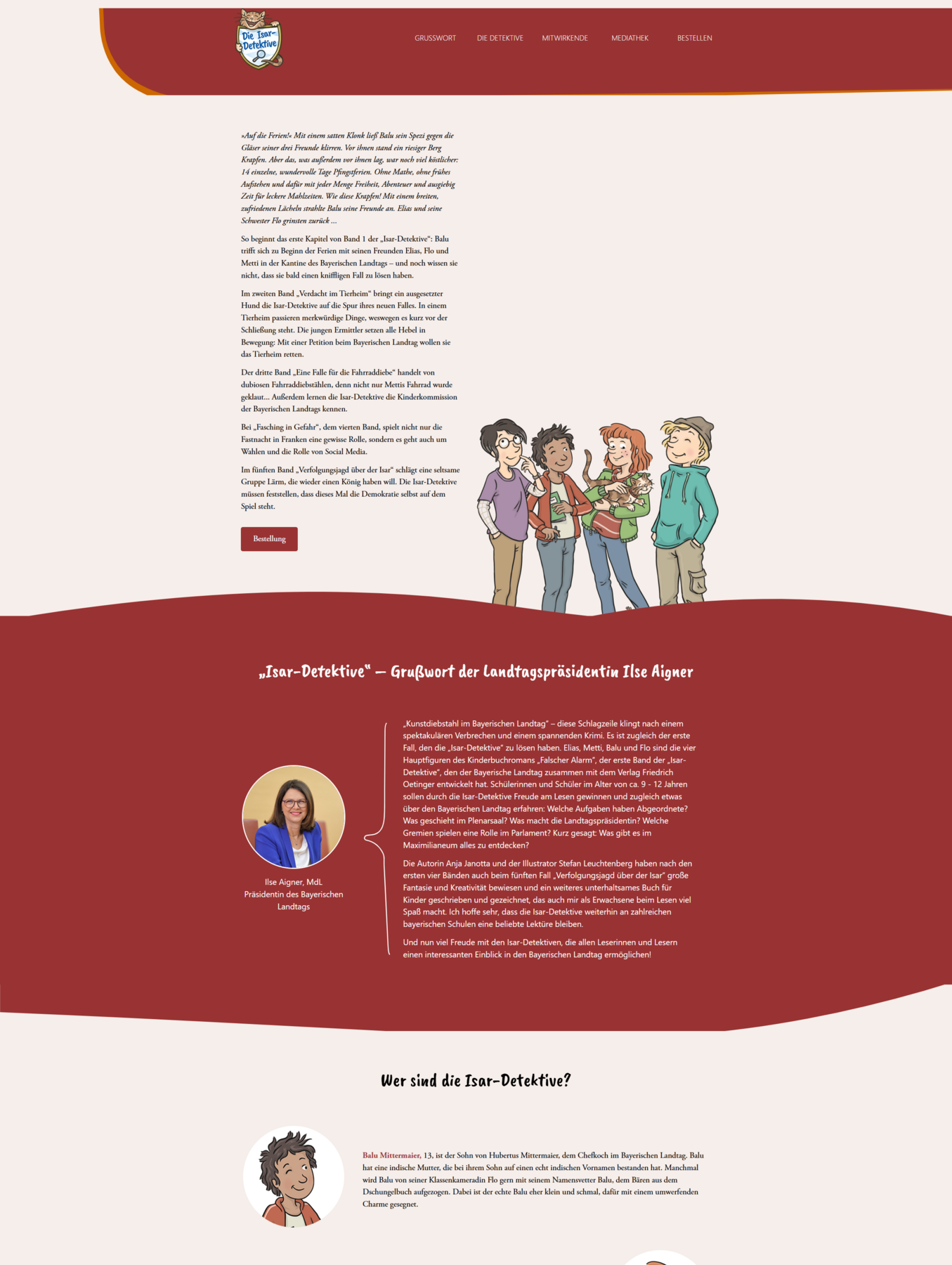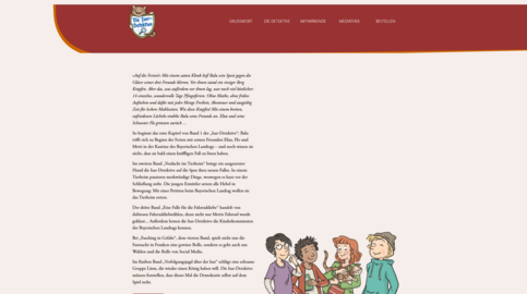Das dynamische Design der Webseite passt zur Zielgruppe und den Illustrationen der Bücher an und liefert Informationen zu den Charakteren, Bestellung, der Autorin und dem Illustrator.