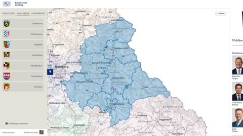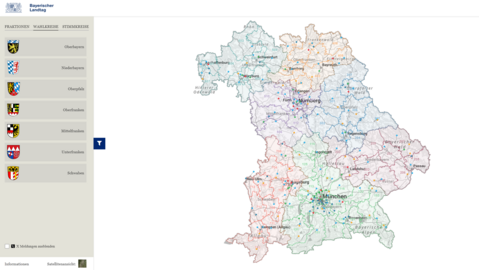 Die Karte wurde mit dem Karten-Klienten OpenLayers realisiert und bindet als Hintergrund Rasterkacheln des BayernAtlas ein. Die Abgeordneten sind mit ihrem Abgeordnetenbüro auf der Karte mit einer Stecknadel verortet, beim Zoom in die Karte werden Porträts und weitere Informationen sichtbar. Stimmkreise und Wahlkreise sind als Polygone hinterlegt. Die Abgeordneten sind nach Fraktion, Wahlkreis oder Stimmkreis filterbar. Bei Klick auf einen der Abgeordneten wird automatisch der passende Kartenausschnitt im Zoom dargestellt.