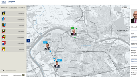 Der Bayrische Landtag ist eines der obersten Staatsorgane Bayerns mit Sitz im Münchener Maximilianeum. Für die gewählten Abgeordneten hat SimpleThings eine interaktive Abgeordnetenkarte realisiert.