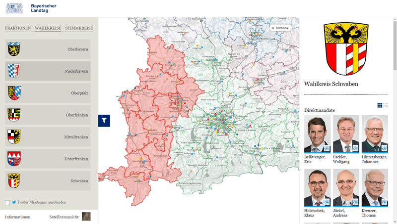 Der Bayrische Landtag ist eines der obersten Staatsorgane Bayerns mit Sitz im Münchener Maximilianeum. Für die gewählten Abgeordneten hat SimpleThings eine interaktive Abgeordnetenkarte realisiert.