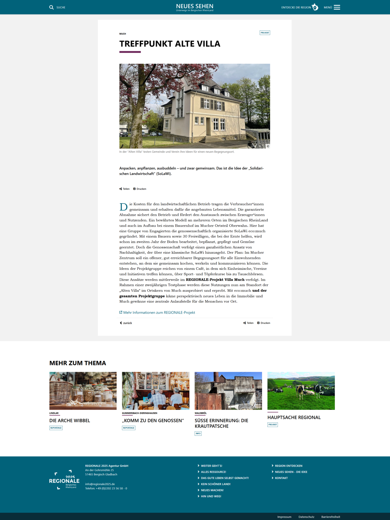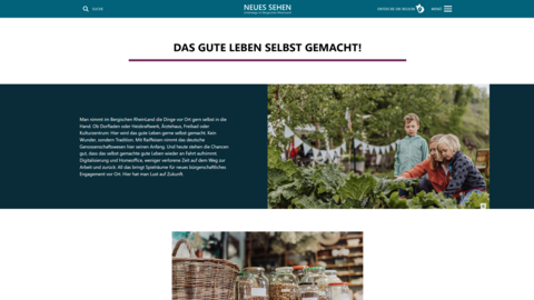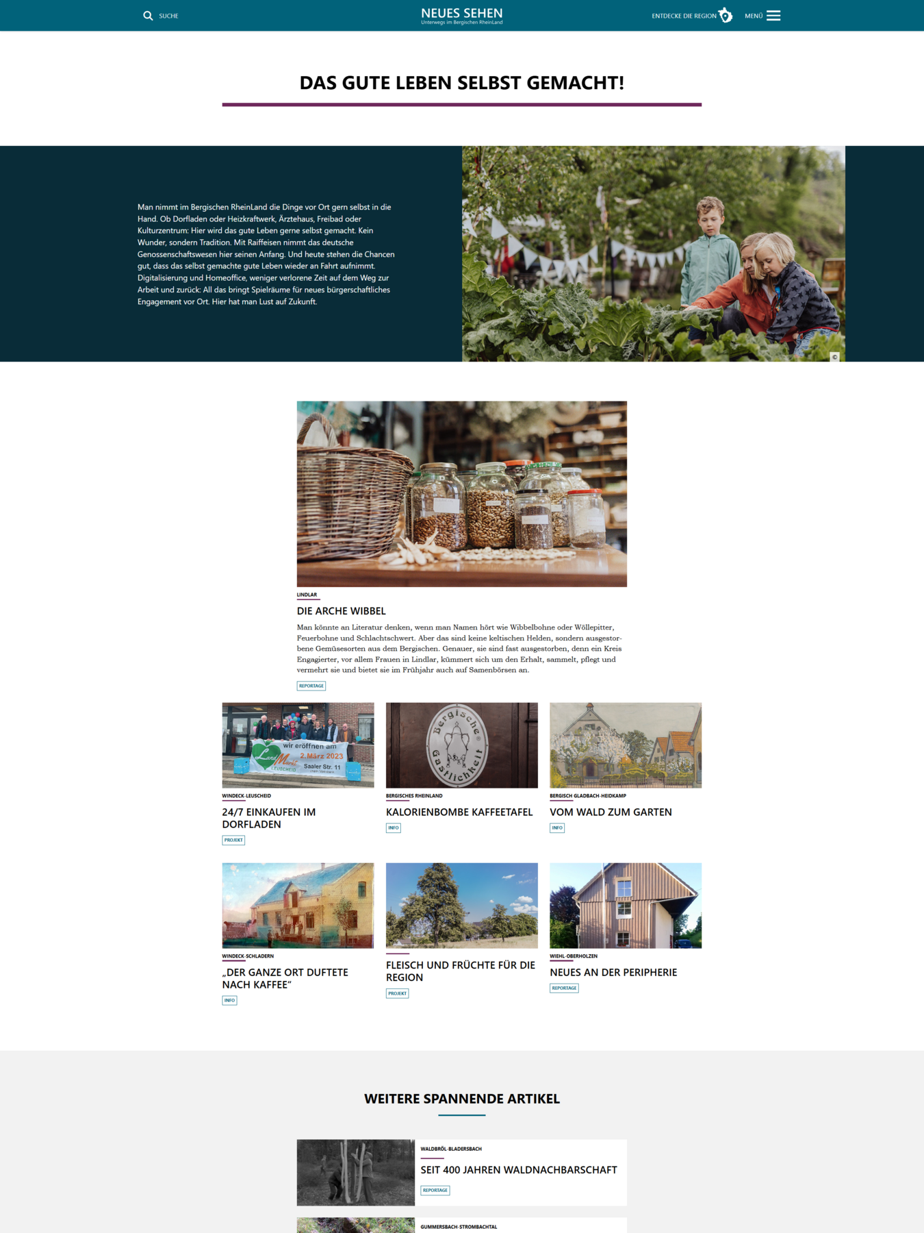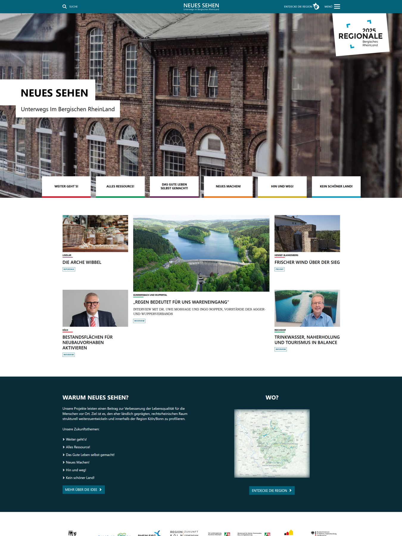 Für die REGIONALE 2025-Agentur haben wir den digitalen Auftritt der Zeitung „NEUES SEHEN. Unterwegs im Bergischen RheinLand“ realisiert. Seit 2022 informiert das Magazin über Projekte der REGIONALE 2025 sowie über Menschen und Ideen, die das Leben und Miteinander im Bergischen RheinLand gestalten.