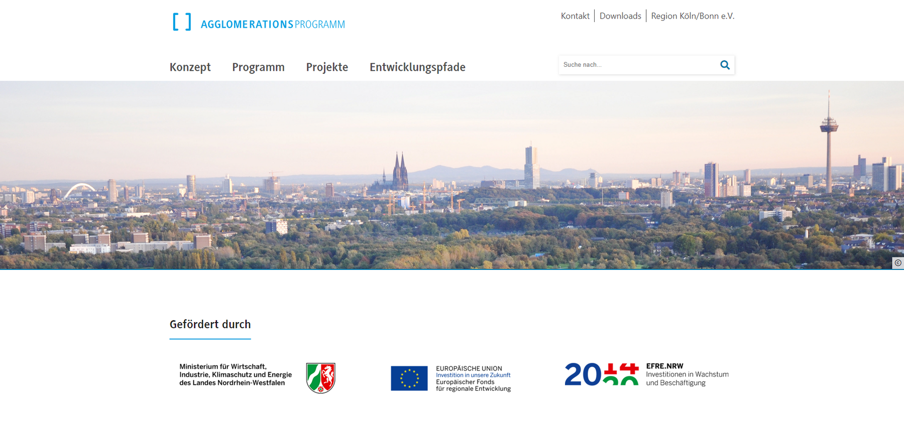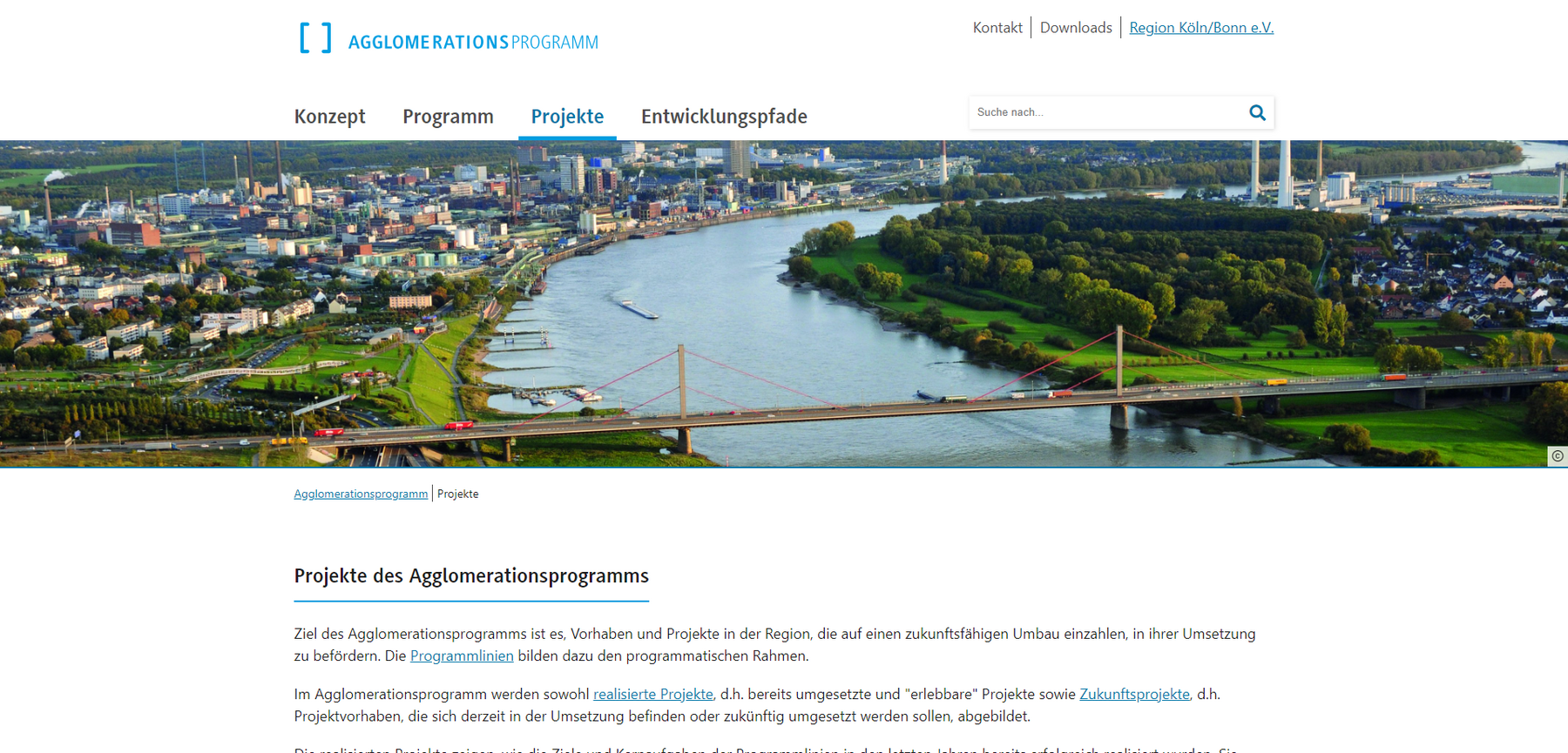 Das Agglomerationsprogramm ist eine kooperative Initiative des Region Köln/Bonn e.V. und der Region selbst. Es dient als umsetzungsorientiertes Entwicklungsprogramm, das auf den Strategien des Agglomerationskonzepts und der Klimawandelvorsorgestrategie basiert. Das Programm definiert strukturelle Umbau- und Transformationsaufgaben, verknüpft mit Zielen und Zukunftsprojekten vor Ort. Die Umsetzung erfolgt dynamisch über die kommenden Jahre, begleitet vom Region Köln/Bonn e.V.