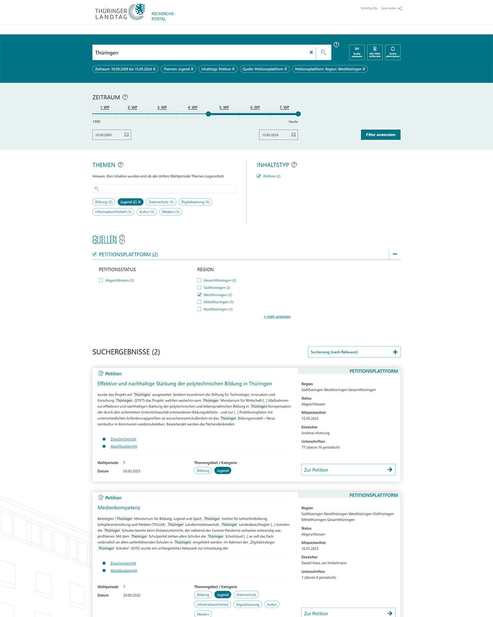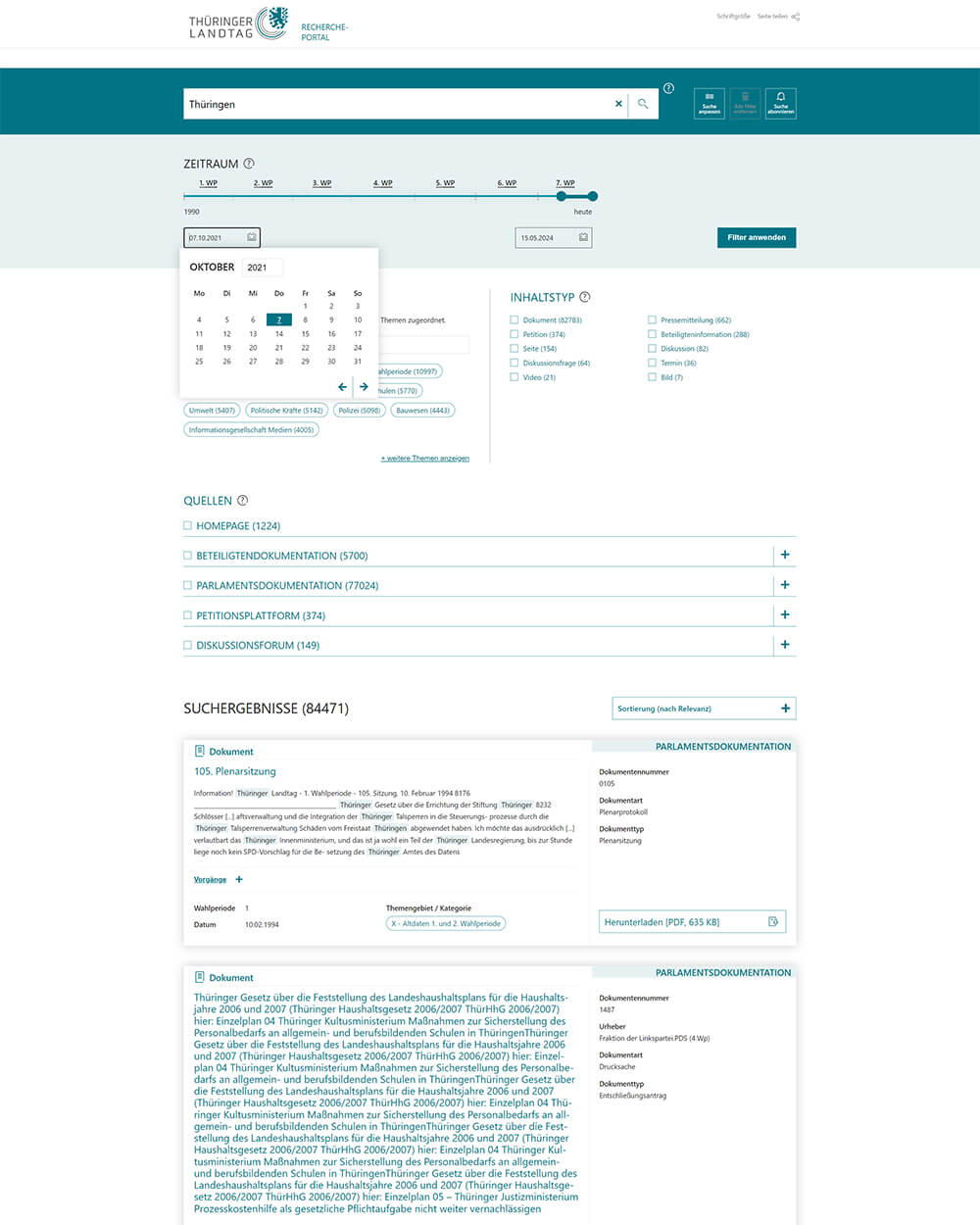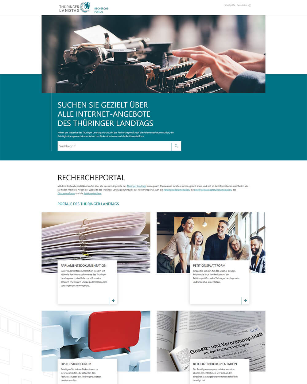 Mit dem Rechercheportal des Thüringer Landtags wird der Zugriff auf alle relevanten Informationen aus einer Hand ermöglicht. Hier lassen sich nicht nur die Webseite des Thüringer Landtags durchsuchen, sondern auch die Parlamentsdokumentation, die Beteiligtentransparenzdokumentation, das Diskussionsforum und weitere Seiten des Landtags.