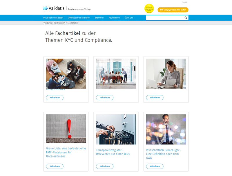 Validatis ist eine neue Marke und ein Geschäftsbereich des Bundesanzeiger Verlages unter der Services und Lösungen rund um Unternehmensdaten angeboten werden. Auf der neuen Website www.validatis.de können sich Nutzer leicht einen Überblick über die Angebote verschaffen. SimpleThings hat den Webauftritt auf Basis des TYPO3 CMS realisiert und für verschiedene Geräte, vom Handy bis zum PC, optimiert. Die Suchfunktion der Website basiert auf Apache Solr.